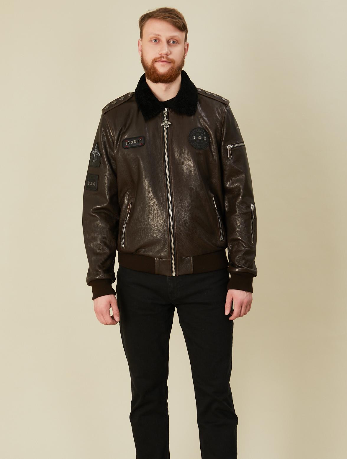 Мужская куртка-авиатор из натуральной тиснёной кожи с отложным воротником из меха овчины. Модель прямого силуэта с втачным рукавом, застёжкой на молнию. Низ изделия и рукава на резинке из плотного трикотажного полотна. Прорезные карманы на молнии. Куртка оформлена декоративными нашивками ввиде фирменных эмблем. На левом рукаве два прорезных кармана на молнии. Спинка изделия декорирована  тиснением в форме самолёта. Вся фурнитура выполнена из высококачественного материала.