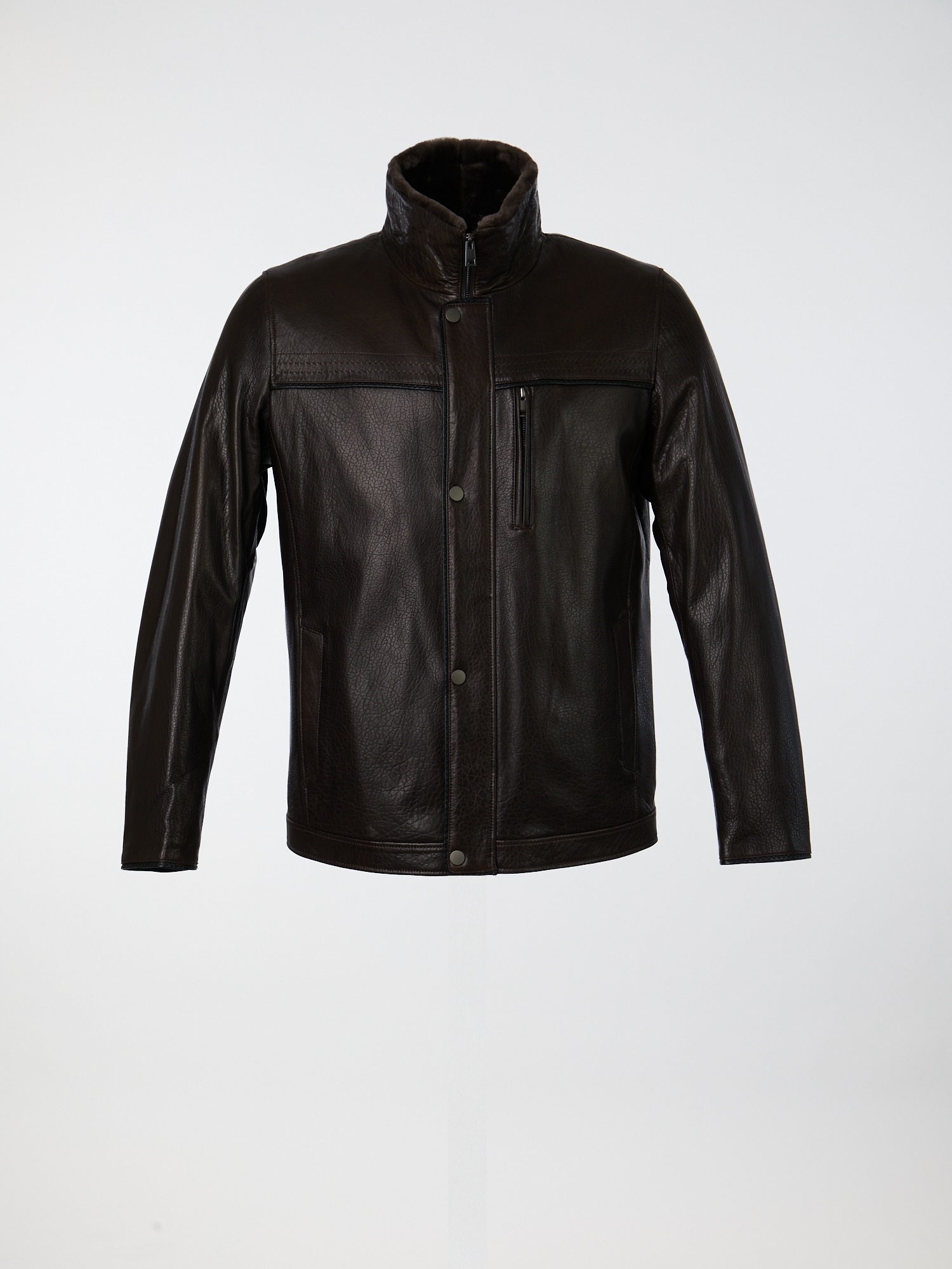 Укороченная куртка из натуральной фактурной кожи, утепленная меховой овчиной. Модель прямого силуэта с воротником стойкой и фронтальной застежкой на молнию, прикрытую ветрозащитной планкой на кнопках. Втачные рукава регулируются по длине с помощью подгибки. Боковые прорезные карманы с листочкой на магнитной застежке, верхний нагрудный карман в рамке с застежкой на молнию. Для важных мелочей предусмотрены два внутренних кармана. Дополняет дизайн изделия отделка кантом из кожи контрастного оттенка.