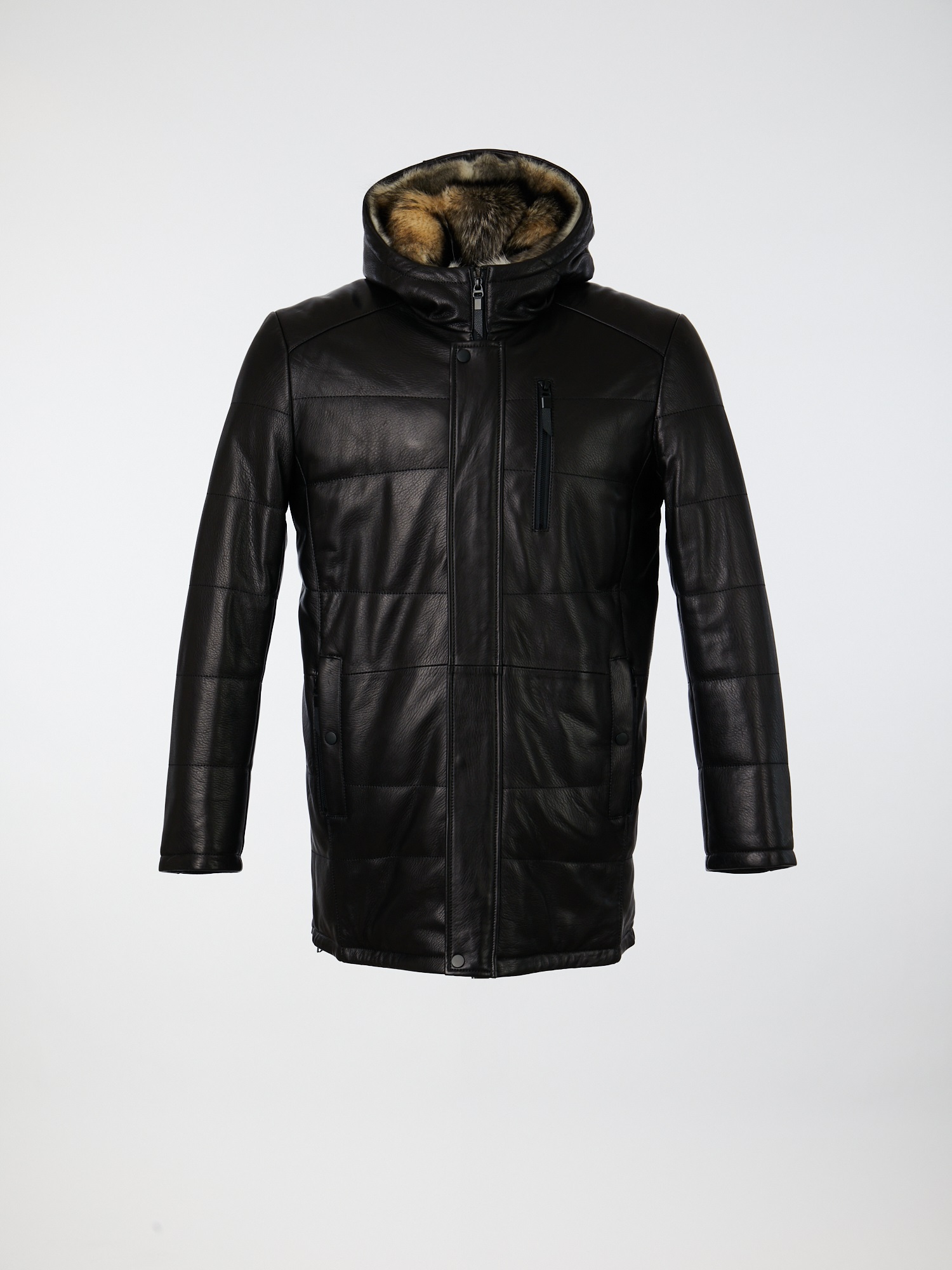 Зимняя куртка из натуральной фактурной кожи на меховом подкладе из волка с теплым капюшоном. Модель прямого силуэта с фронтальной застежкой на металлическую молнию, прикрытую ветрозащитной планкой на кнопках. Втачные рукава. Двойные прорезные карманы с листочкой на кнопке и застежкой на молнию. В боковых швах расположены шлицы с фиксацией на кнопки и молнию. Для важных мелочей предусмотрены два внутренних кармана.
