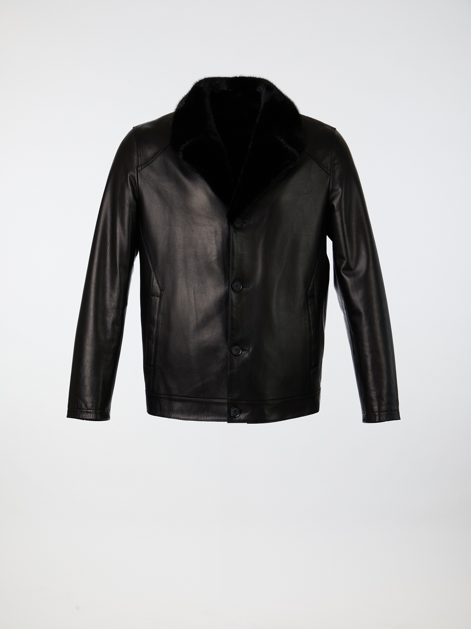 Зимняя куртка из натуральной фактурной кожи на меховой овчине с английским воротником из меха норки. Модель прямого силуэта с фронтальной застежкой на пуговицы, низ изделия на пришивной манжете. Втачные руква регулируются по длине с помощью подгибки. Прорезные карманы с листочкой на магнитной застежке с боковым входом.