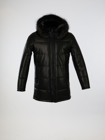—Удлиненный кожаный пуховик с капюшоном и отделкой мехом енота