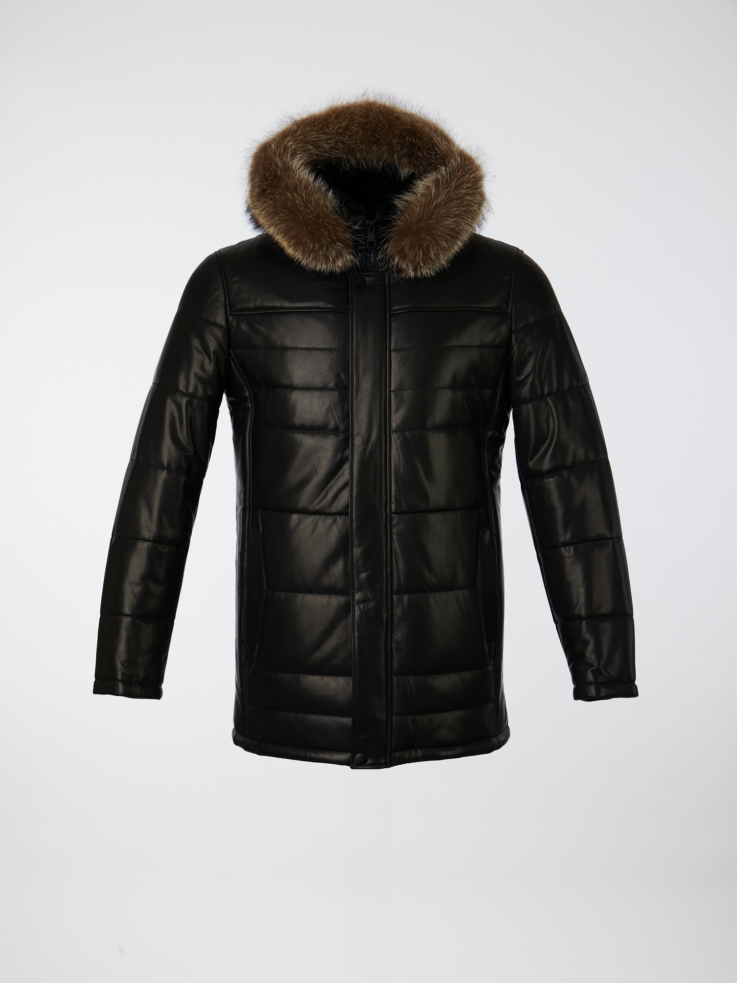 —Удлиненный кожаный пуховик с капюшоном и отделкой мехом енота