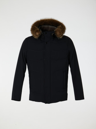 Зимняя куртка из плащевой ткани японского производства с натуральным утеплителем "пух-перо". Модель полуприлегающего силуэта с воротником стойка, съемным капюшоном и съемной отделкой меха енота. Фронтальная застежка на металлическую молнию, прикрытая ветрозащитной планкой на кнопках. Втачной рукав с внутренней трикотажной манжетой. Две пары прорезых карманов с листочкой на магните и на молнии. Для важных мелочей предусмотрено два внутренних кармана с застежкой на молнию. Дополняет дизайн изделия горизонтальная стежка, выполненная путем "горячей пайки".