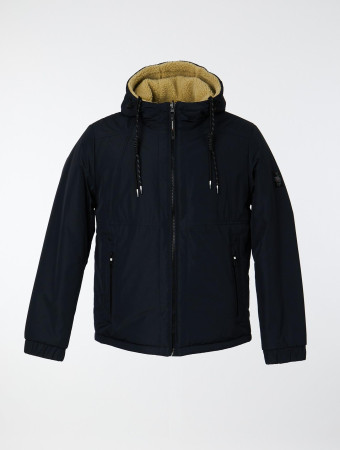 Укороченная двусторонняя мужская куртка с регулируемым по объёму капюшоном. Одна сторона выполнена из современного искусственного меха контрастного цвета, который обеспечивает комфорт. Рукав втачной с притачной манжетой на резинке. Изделие застёгивается на фронтальную тракторную молнию. Модель  дополнена нагрудным и боковыми прорезными карманами, которые фиксируются  при помощи молний. Ширина низа куртки регулируется потайной кулиской. Качественная фурнитура и нашивка с буквенным логотипом на левом рукаве завершают дизайн модели.