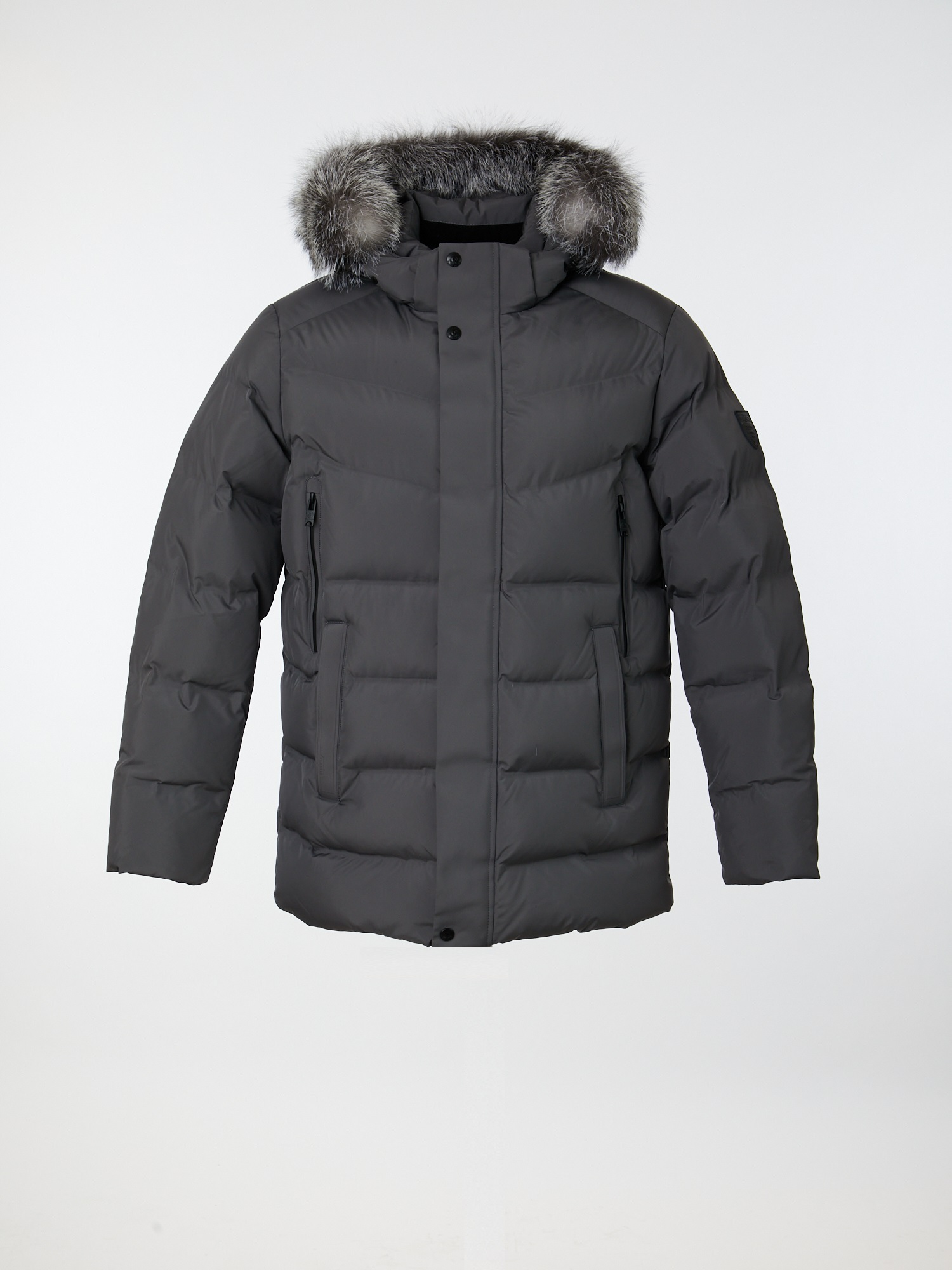 Мужская куртка прямого силуэта со съёмным, регулируемым по объёму и высоте капюшоном. Капюшон оформлен съёмной опушкой из натурального меха ( чернобурая лиса ). Воротник-стойка с внутренней стороны утеплён флисом. Изделие застёгивается на фронтальную тракторную молнию с двумя бегунками, прикрытую ветрозащитной планкой с потайными кнопками. Рукав втачной с внутренней трикотажной манжетой. Модель дополнена нагрудными и боковыми прорезными карманами с листочками, которые фиксируются при помощи молний и кнопок. Для мелочей предусмотрено два внутренних кармана. Ширина низа изделия регулируется потайной кулиской. Для пошива куртки используется плотная дышащая ткань с водоотталкивающей пропиткой. Горизонтальная термостёжка помогает синтетическому наполнителю равномерно распределиться. Качественная фурнитура и нашивка с буквенным логотипом на левом рукаве завершают дизайн модели.