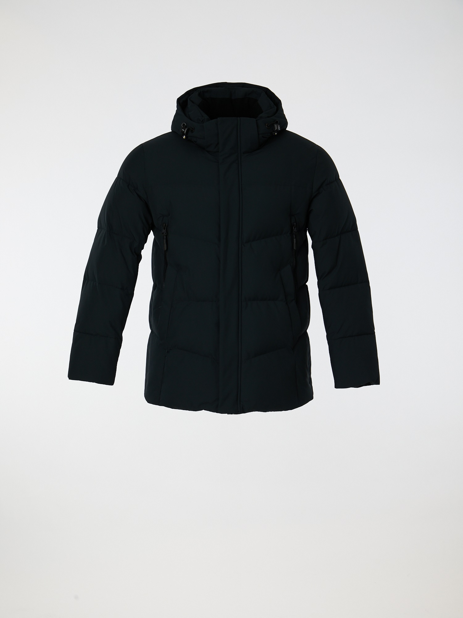 Современная мужская куртка со съёмным, регулируемым по объёму и высоте капюшоном. Высокий воротник-стойка с внутренней стороны утеплён флисом. Изделие застёгивается на фронтальную тракторную молнию с двумя бегунками, прикрытую ветрозащитной планкой с потайными кнопками. Рукав втачной с внутренней трикотажной манжетой. Четыре прорезных кармана фиксируются при помощи магнитных застёжек и кнопок. Мешковина карманов выполнена из флиса. Для мелочей предусмотрено два внутренних кармана. Ширина низа изделия регулируется потайной кулиской. Для пошива куртки используется плотная дышащая ткань с водоотталкивающей пропиткой. Горизонтальная стёжка помогает синтетическому наполнителю равномерно распределиться.