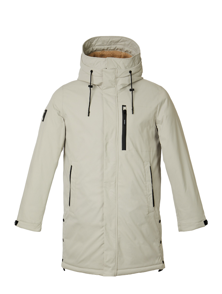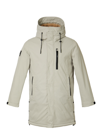 Современное мужское полупальто прямого силуэта с регулируемым по объёму капюшоном. Внутренняя часть капюшона утеплена искусственным мехом. Рукав втачной с внутренней трикотажной манжетой. Ширина рукава регулируется при помощи паты с текстильной застёжкой. Изделие застёгивается на фронтальную тракторную молнию с двумя бегунками, прикрытую ветрозащитной планкой с потайными кнопками. Модель дополнена нагрудным и боковыми прорезными карманами с двумя независимыми входами, которые фиксируются молниями и магнитными застёжками. Мешковина карманов выполнена из флиса. Для важных мелочей предусмотрено два внутренних кармана. В боковых швах расположены разрезы на кнопках. Качественная фурнитура контрастного цвета и нашивка на правом рукаве завершают дизайн изделия.