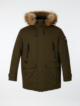 Удлинённая мужская куртка прямого силуэта с регулируемым по объёму и высоте капюшоном. Капюшон оформлен съёмной опушкой из натурального меха ( енот ). Внутренняя часть капюшона утеплена флисом контрастного цвета. Рукав втачной с внутренней трикотажной манжетой. Ширина рукава регулируется при помощи паты с текстильной застёжкой. Изделие застёгивается на фронтальную тракторную молнию с двумя бегунками, прикрытую ветрозащитной планкой с потайными кнопками. Модель дополнена прорезными нагрудными и боковыми карманами, которые фиксируются молниями. Боковые карманы оформлены декоративными клапанами. Мешковина карманов выполнена из флиса. Для важных мелочей предусмотрено два внутренних кармана. Ширина спинки регулируется потайной кулиской. Качественная фурнитура и нашивка с фирменным логотипом на левом рукаве завершают дизайн модели.