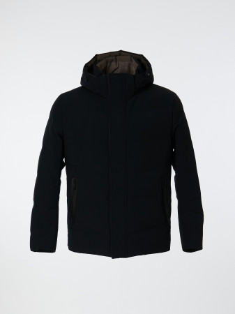 Укороченный пуховик с воротником стойкой и съемным капюшоном, регулируемым по объему с помощью кулисы. Модель прямого силуэта с фронтальной застежкой на молнию, проикрытую ветрозащитной планкой на кнопках. Втачные рукава с внутренней трикотажной манжетой. Прорезные карманы в рамке из натуральной кожи. Пуховик выполнен из плащевой ткани японского производства с натуральным утеплителем "пух-перо". Для важных мелочей предусмотрено два внутренних кармана с застежкой на молнию. Дополняет дизайн изделия горизонтальная стежка, выполненная путем "горячей пайки".
