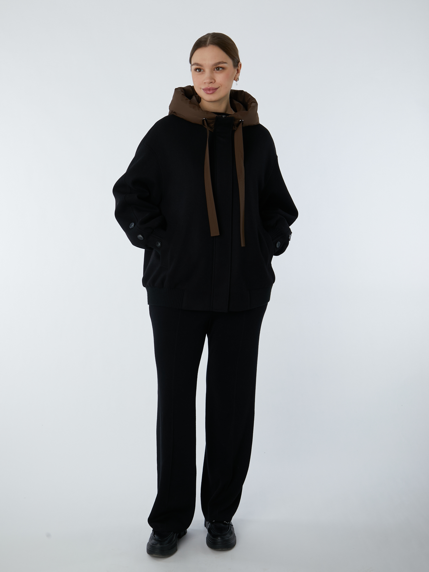 Драповая куртка с капюшоном из плащевой ткани, регулируемым по объему с помощью кулисы. Модель прямого силуэта с застежкой на молнию, прикрытую ветрозащитной планкой на кнопках. Прорезные карманы с листочкой и боковым входом. Низ изделия и рукава-регланом на трикотажной манжете. Дополняет дизайн изделия декоративные пуговицы на рукавах.