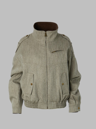 Современный бомбер из пальтовой ткани с воротником-стойкой. Модель застёгивается на металлическую молнию. Рукав со спущенной линией плеча с притачной манжетой, ширина которого регулируется кнопками. Боковые карманы с декоративными клапанами фиксируются при помощи кнопок. Дополнительный трикотажный воротник и погоны завершают дизайн изделия.