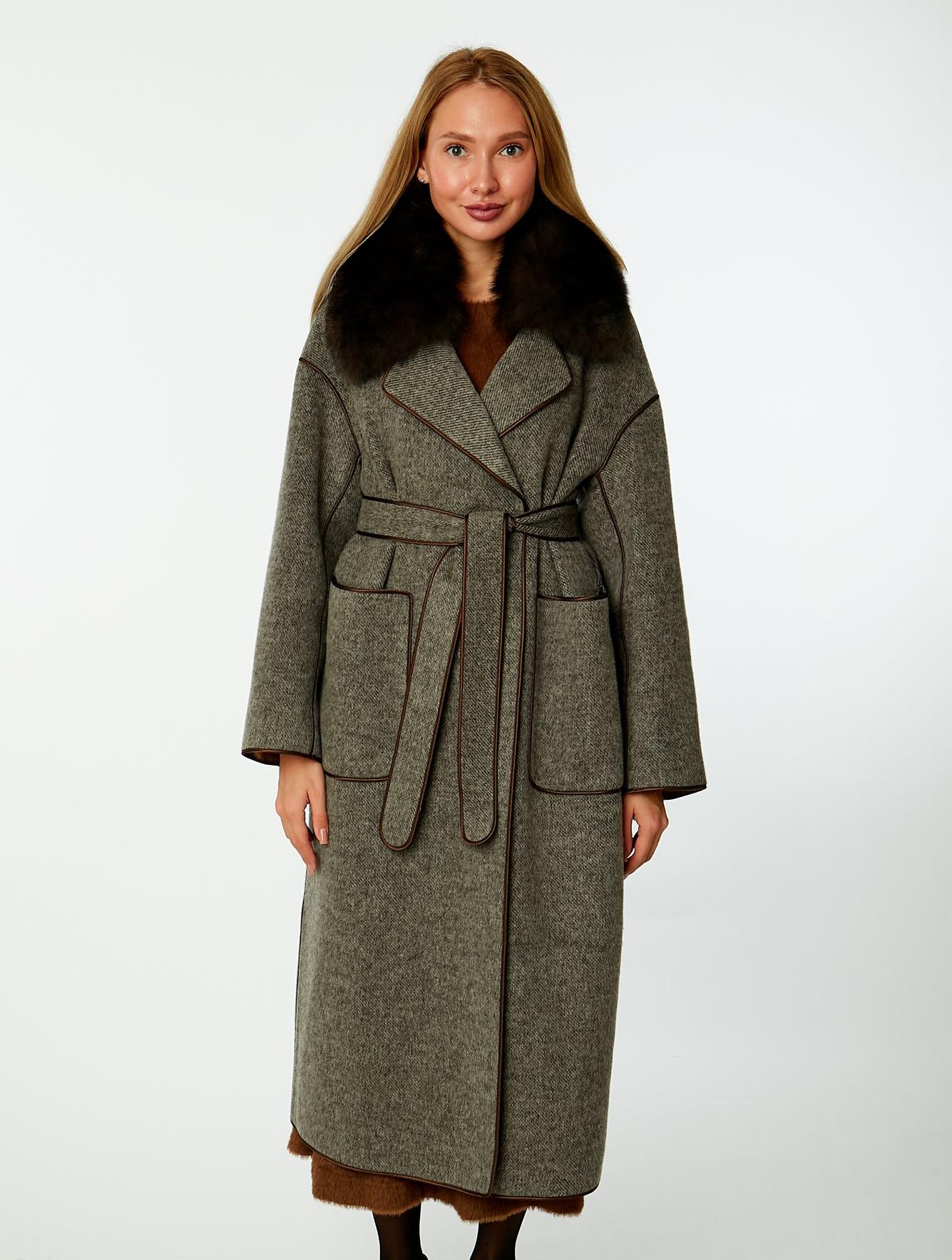 Стильное пальто из кашемировой ткани премиум класса без подклада с английским воротником и съемным мехом канадского песца цвета "соболь". Модель прямого силуэта с застежкой на пришивные кнопки. Спущенная линия плеча и втачные рукава, регулируемые по длинне с помощью подгибки. Удобные накладные карманы. На спинке изделия по центральному шву расположена шлица. Дополняет дизайн пальто отделка тесьмой контрастного оттенка.