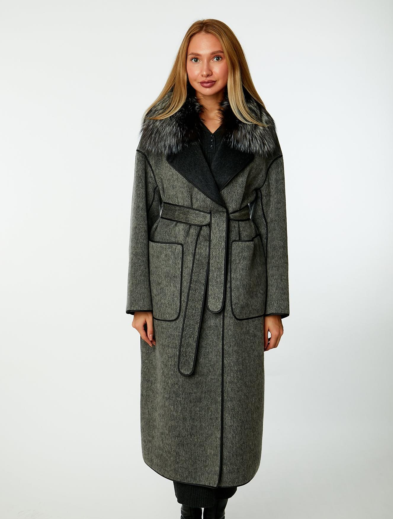 Стильное пальто из кашемировой ткани премиум класса без подклада с английским воротником и съемным мехом чернобурой лисицы. Модель прямого силуэта с застежкой на пришивные кнопки. Спущенная линия плеча и втачные рукава, регулируемые по длинне с помощью подгибки. Удобные накладные карманы. На спинке изделия по центральному шву расположена шлица. Дополняет дизайн пальто отделка тесьмой контрастного оттенка.