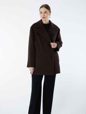 Укороченное пальто из высококачественной шерстяной ткани с объемным воротником английской формы. Двубортная модель прямого силуэта с застежкой на пуговицы. Втачные рукава регулируются по длине с помощью подгибки. Прорезные карманы с широкой листочкой и боковым входом.