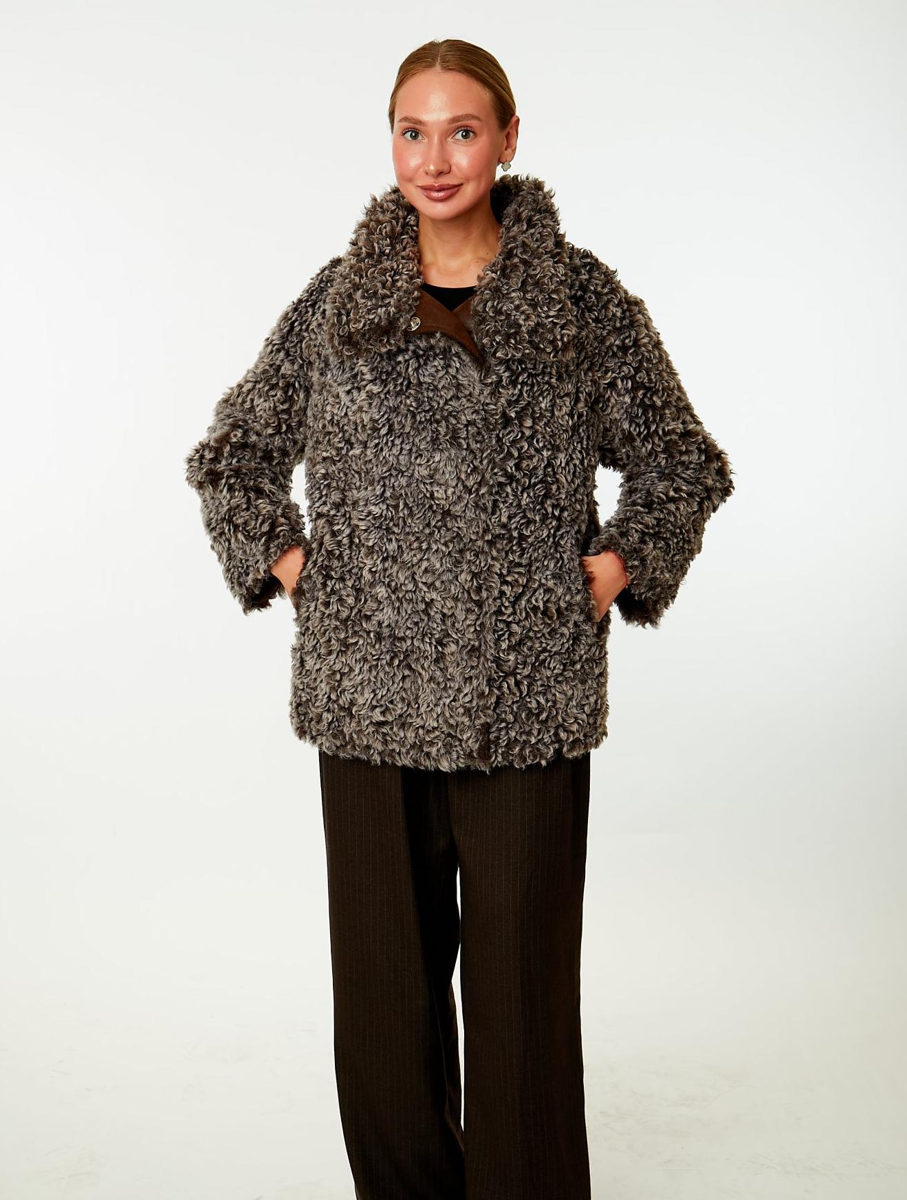 Двусторонняя экодубленка с отложным воротником, переходящим в высокую стойку с магнитной застежкой. Модель прямого силуэта с ассиметричной застежкой на пришивные кнопки. Спущенная линия плеча и втачные рукава, регулируемые по длинне с помощью подгибки. Прорезные карманы с боковым входом.