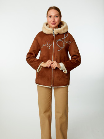 Укороченная двустороння экодубленка с теплым капюшоном. Модель прямого силуэта с фронтальной застежкой на металлическую молнию. Втачные рукава регулируются по длинне с помощью подгибки. Прорезные карманы в рамке с боковым входом.
