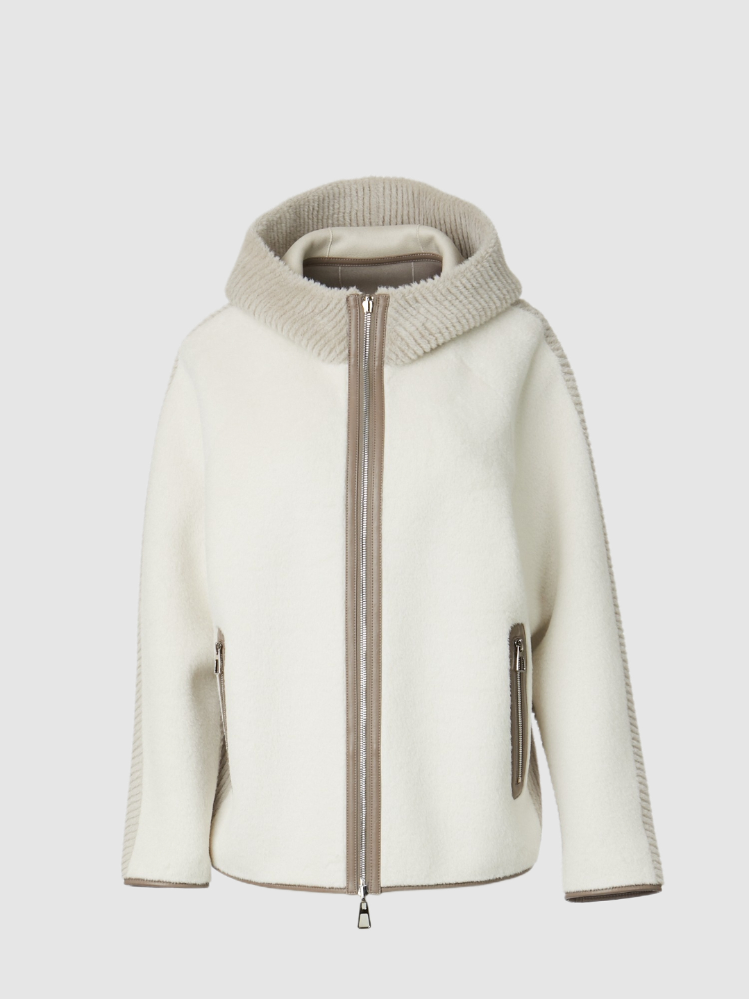 Комбинированная экодубленка с отделкой экокожей и капюшоном в форме капора, переходящим в стойку. Двусторонняя модель  прямого силуэта с фронтальной застежкой в рамке на молнию с двумя бегунками. Комбинированные рукава регланом регулируются по длине с помощью подгибки.Прорезные карманы в рамке из экокожи с застежкой на молнию. Экодубленка - это не просто элемент гардероба, а подлинного сочетание стиля и комфорта. Изделия изготавливают из высококачественных синтетических материалов, которые имитирут натуральный мех и обладают превосходными теплоизоляционными свойствами.