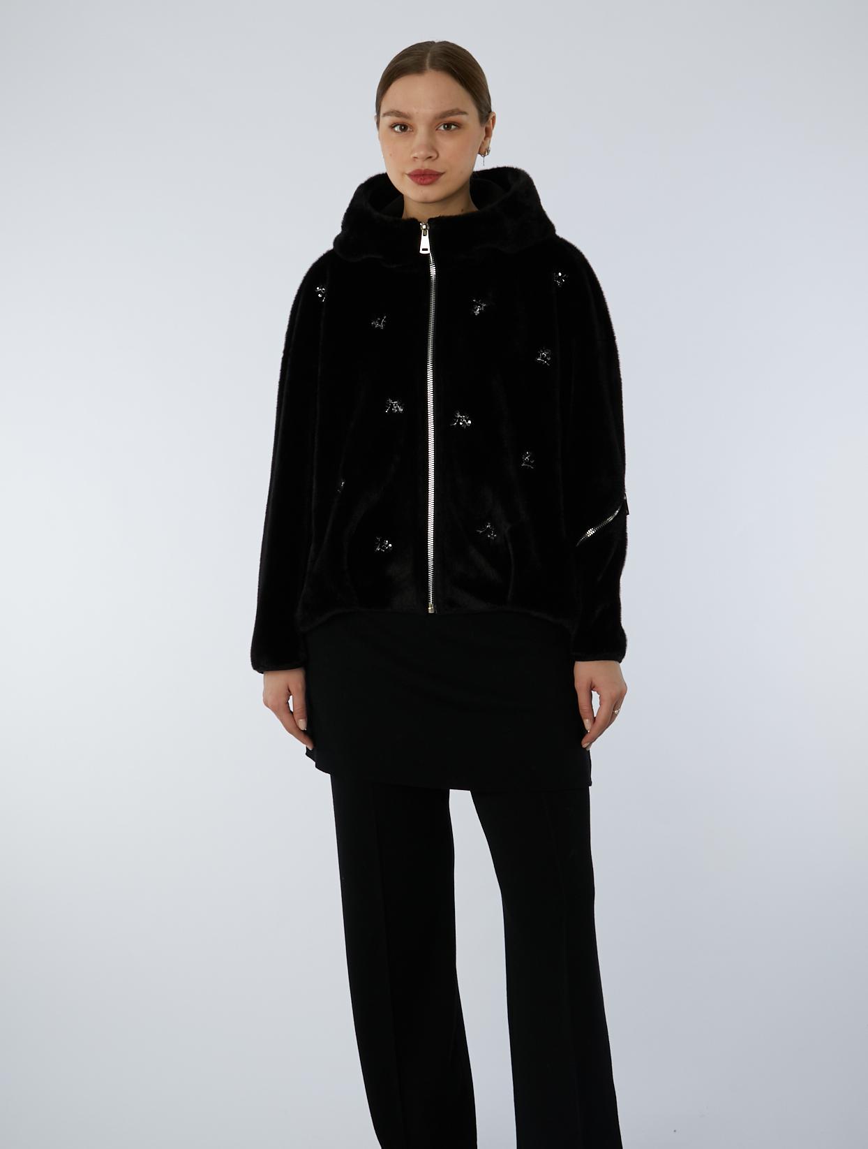 Меховая экодубленка с капюшоном. Модель прямого силуэта с защипами по низу изделия. Фронтальная застежка на металлическую молнию расположена в рамке. Спущенная линия плеча и втачные рукава, на левом рукаве декоративная молния. Вертикальные прорезные карманы с застежкой на молнию. Дополняет дизайн изделия вышивка бисером ручной работы.