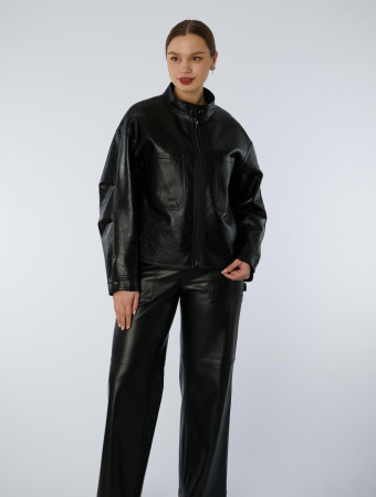 Укороченная экодубленкарубашка с защитным покрытием "силк" и воротником стойкой, который фиксируется с помощью кнопок. Модель прямого силуэта с застежкой на металлическую молнию. Втачные рукава с пришивной манжетой и фиксацией на кнопку. Завышеные накладные карманы из экокожи с горизонтальным входом. Дополняет дизайн изделия пришивная окантовка из экокожи и защипы на локтевых сгибах.