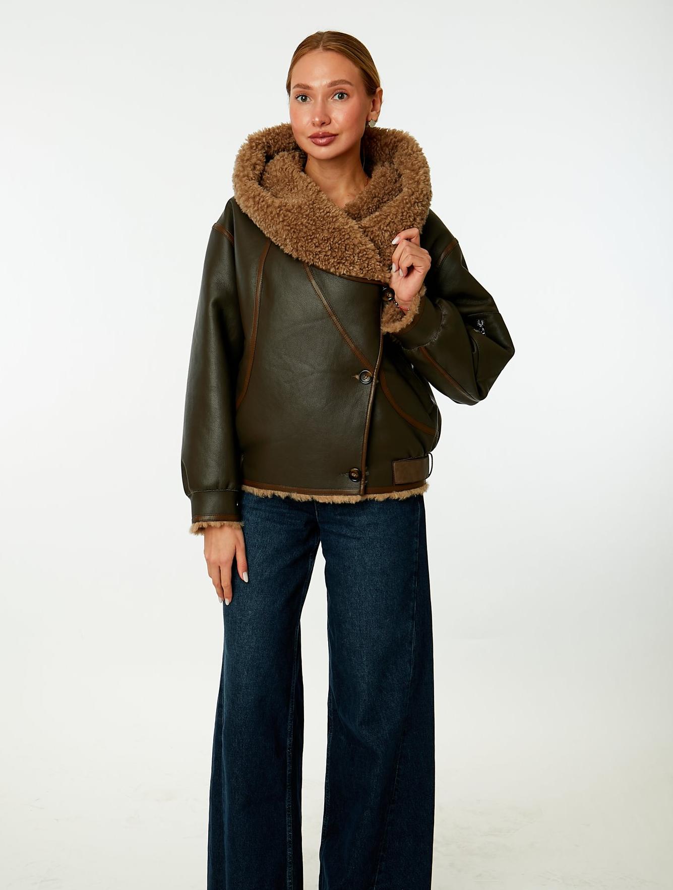 Укороченная экодубленка в стиле "пилот" с объемным капюшоном и отделкой экокожей контрастного оттенка. Модель прямого силуэта с ассиметричной застежкой на пуговицы. Спущенная линия плеча и втачные рукава с манжетой и фиксацией на пуговицу, на левом рукаве накладной карман-монетница с застежкой на молнию. Прорезные крманы с листочкой. Дополняет дизайн дубленки боковые ремешки.