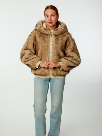 Куртка-бомбер из экомеха "песец" на подкладе с теплым капюшоном и отделкой экокожей. Модель прямого силуэта с манжетой в резинку по низу изделия. Прорезные карманы с боковым входом. Спущенная линия плеча и втачные рукава с пришивной манжетой из экокожи в резинку.