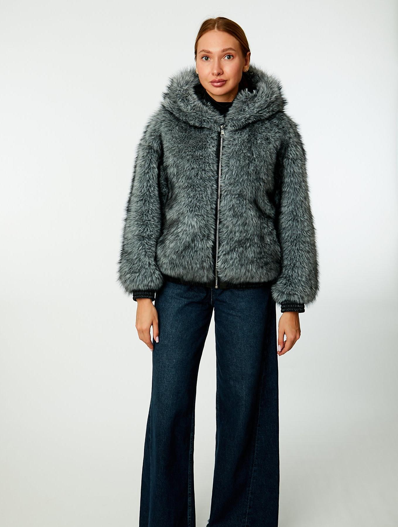 Куртка-бомбер из экомеха "чернобурка" на подкладе с теплым капюшоном и отделкой экокожей. Модель прямого силуэта с манжетой в резинку по низу изделия. Прорезные карманы с боковым входом. Спущенная линия плеча и втачные рукава с пришивной манжетой из экокожи в резинку.