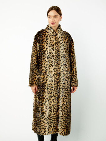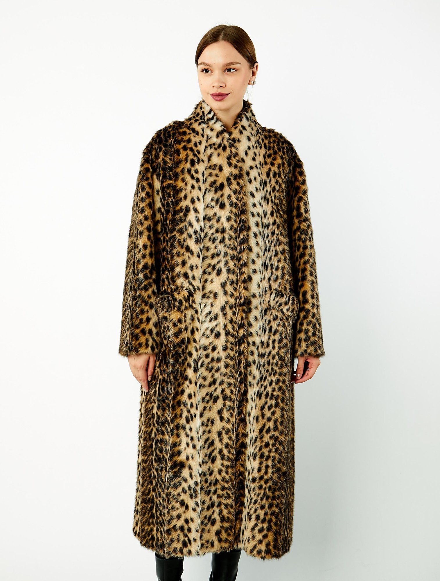 Длинная шуба из экомеха "камышовый кот" с шалевым воротником. Модель прямого силуэта с фронтальной застежкой на шубные крючки. Втачные рукава и прорезные карманы с листочкой и горизонтальным входом.