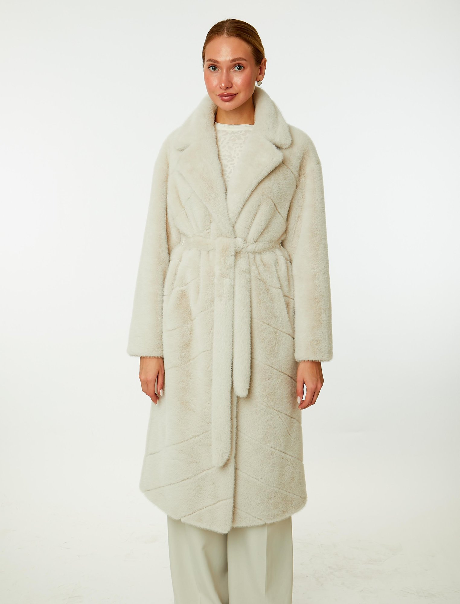 Длинная шуба из эконорки на подкладе с английским воротником. Модель прямого силуэта с фронтальной застежкой на шубные крючки. Спущенная линия плеча и втачные рукава. Прорезные карманы с боковым входом. В комплекте имеется мягкий пояс. Дополняет дизайн изделия диагональная строчка по спинке и передним полочкам.