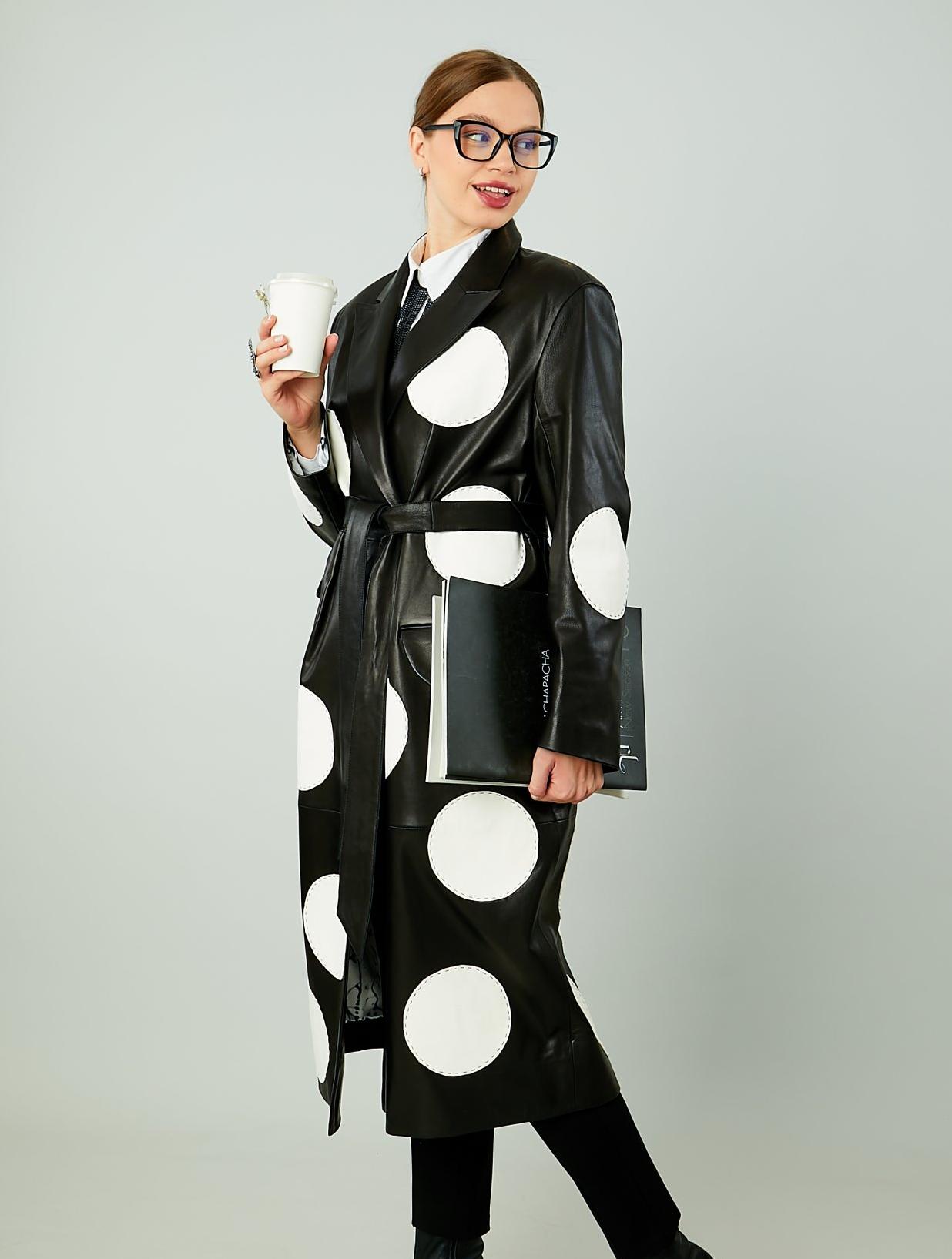 Стильный плащ из натуральной кожи с аппликацией в виде кругов из кожи контрастного оттенка. Модель прямого силуэта с английским воротником и фронтальной застежкой на потайные кнопки. Втачные рукава регулируются с помощью подгибки. Ассиметричные прорезные карманы с клапаном. Наличие пояса позволит выгодно подчеркнуть талию. Дополняет дизайн изделия декоративная строчка "пунто". Эксклюзивный дизайн и отличные характеристики подарят вам уют и хорошее настроение в любую погоду.