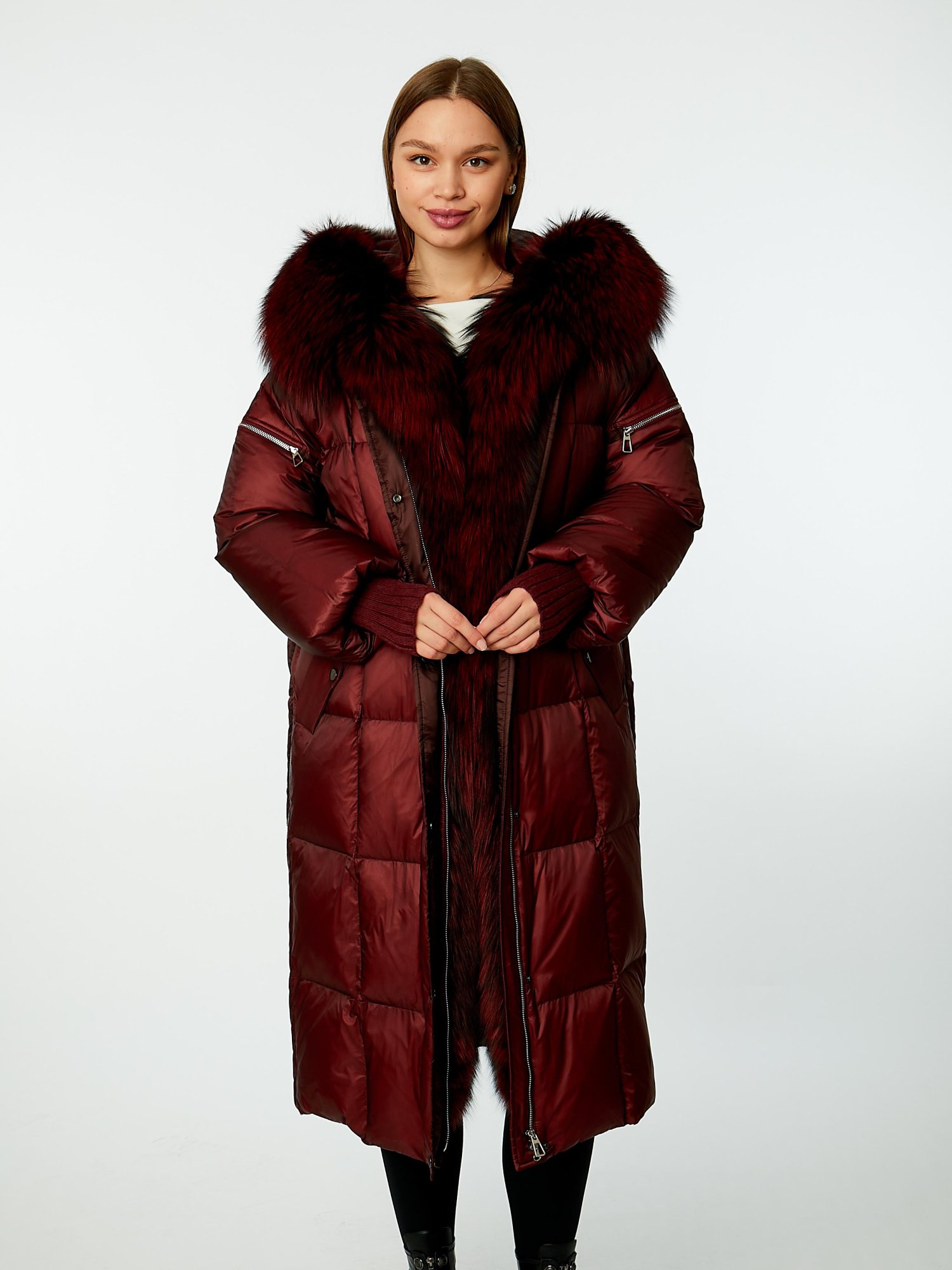 —Длинный пуховик с капюшоном и отделкой мехом лисицы