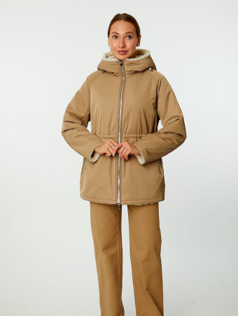 Двусторонняя зимняя куртка из плащевой ткани и экомеха "норка" с теплым капюшоном. Модель прямого силуэта с фронтальной застежкой на двустороннюю молнию с двумя бегунками. Рукава регланом регулируются по длинне с помощью подгибки. На уровне талии имеется регулируемая кулиса, с помощью которой выгодно подчеркивается талия. Прорезные карманы с застежкой на молнию.