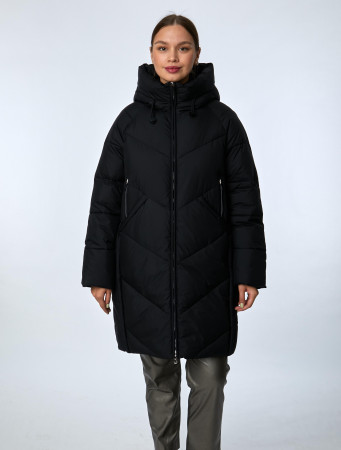Женское полупальто О-образного силуэта с регулируемым по объёму капюшоном. Модель застёгивается на металлическую  молнию с двумя бегунками с внутренней ветрозащитной планкой. Рукав-реглан дополнен внутренней трикотажной манжетой. Изделие имеет две пары удобных карманов, которые фиксируются при помощи магнитных застёжек и молний. Полупальто оформлено геометрической стёжкой и утеплено синтетическим наполнителем.