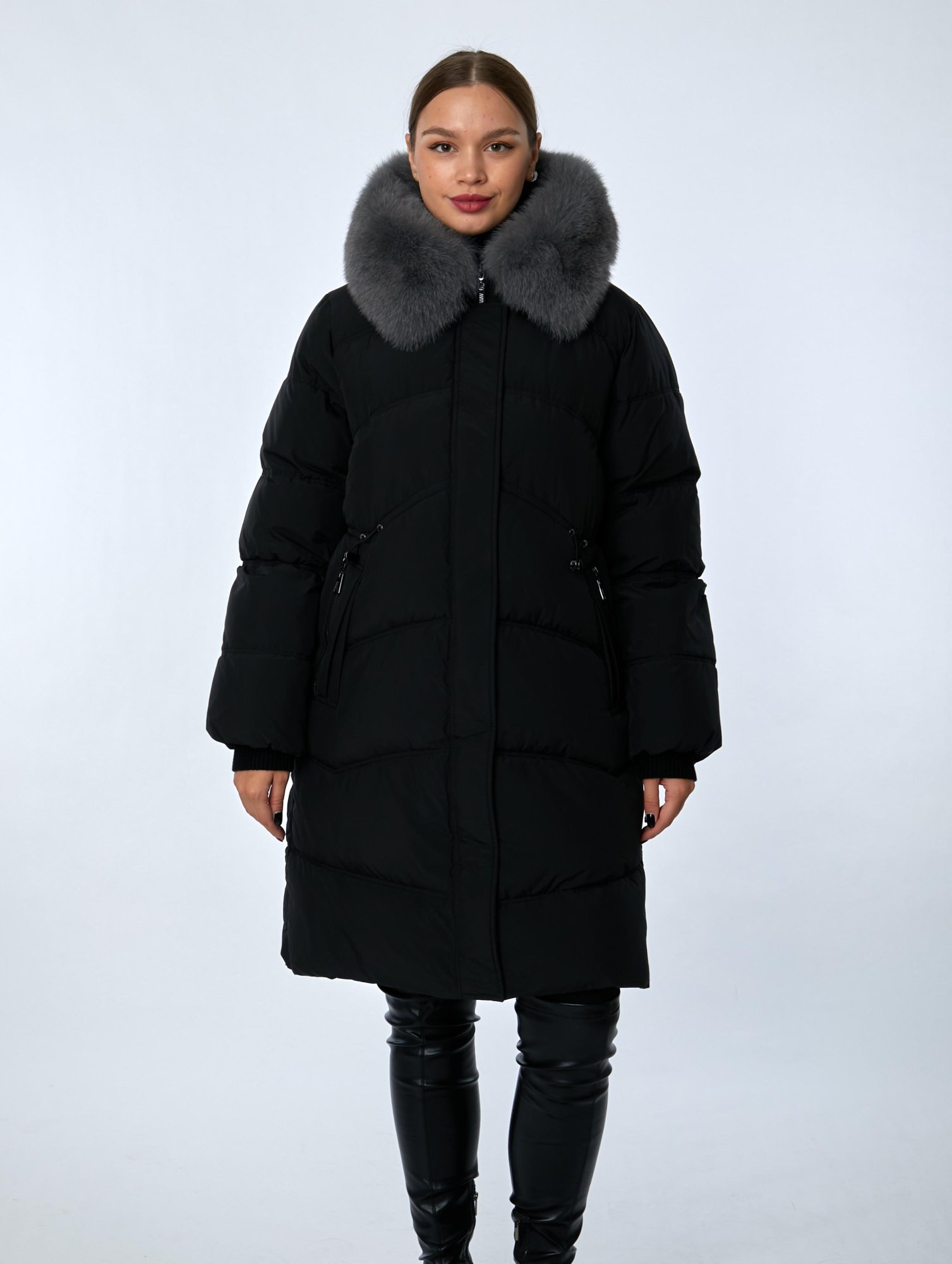 Женское полупальто прямого силуэта с регулируемым по объёму капюшоном. Капюшон оформлен съёмной опушкой из меха. Модель застёгивается на молнию с двумя бегунками, прикрытую ветрозащитной планкой с потайными кнопками. Втачной рукав дополнен трикотажной манжетой в тон изделия. Боковые карманы фиксируются при помощи металлических молний. Ширина изделия по линии талии регулируется кулиской. Модель оформлена геометрической стёжкой и утеплена синтетическим наполнителем.