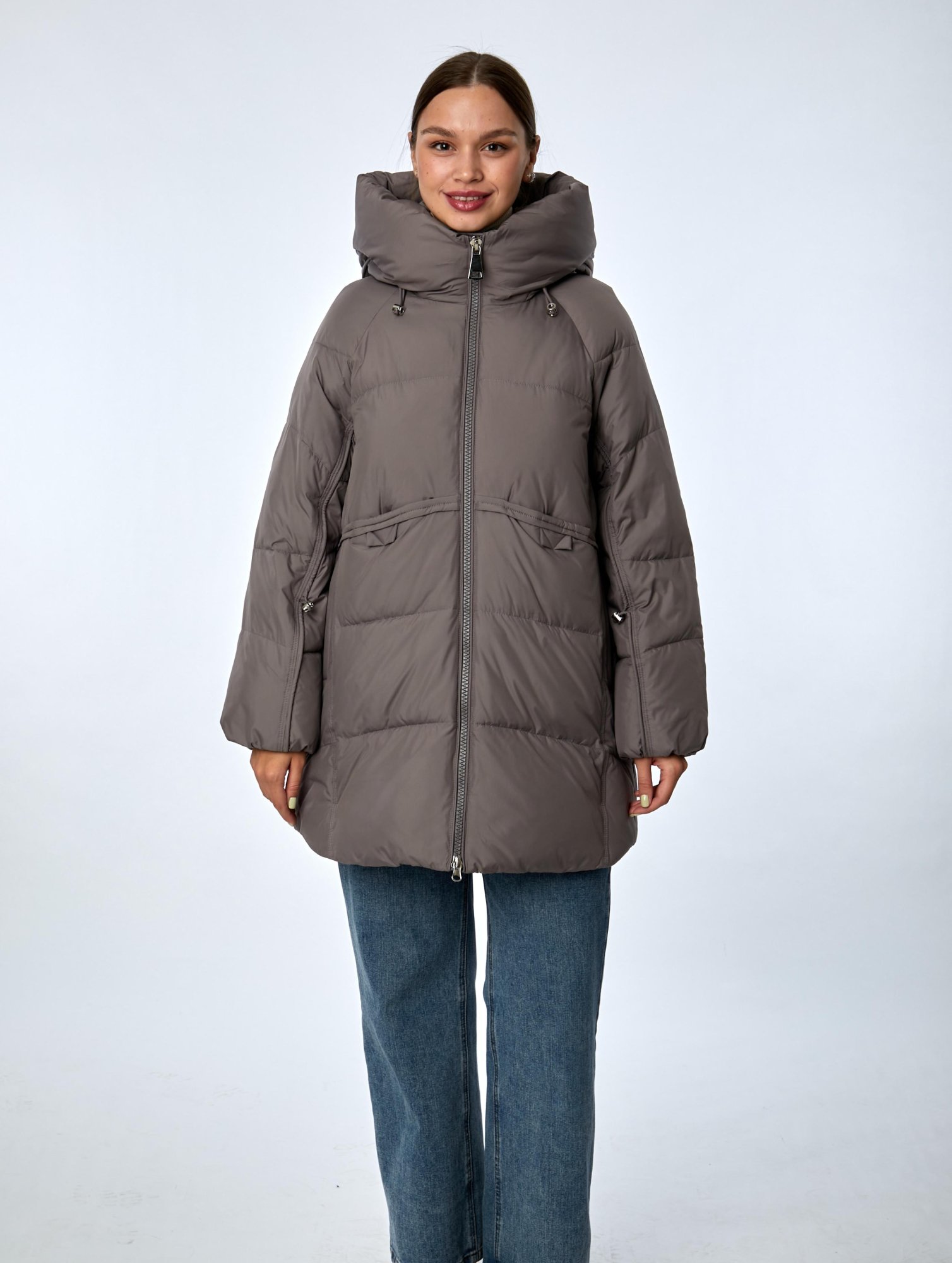 Современное женское полупальто свободного силуэта с регулируемым по объёму капюшоном и воротником-стойкой. Модель застёгивается на тракторную молнию с двумя бегунками. Рукав-реглан дополнен внутренней трикотажной манжетой. Изделие имеет две пары удобных карманов, которые фиксируются при помощи потайных кнопок. Ширина модели по низу регулируется кулиской. Полупальто оформлено горизонтальной стёжкой и утеплено синтетическим наполнителем.