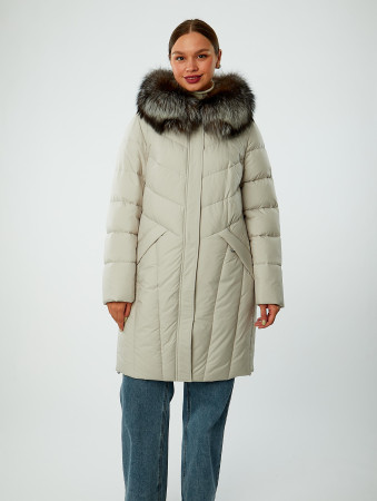 Женское полупальто прямого силуэта с капюшоном. Капюшон оформлен съёмной опушкой из натурального меха (чернобурая лиса). Модель застёгивается на металлическую молнию с двумя бегунками, прикрытую ветрозащитной планкой с потайными кнопками. Втачной рукав дополнен внутренней трикотажной манжетой в тон изделия. Карманы с диагональным входом утеплены флисовой мешковиной и фиксируются при помощи молний. В боковых швах расположены функциональные молнии, которые дают дополнительную свободу при движении. Полупальто оформлено геометрической стёжкой и утеплено синтетическим наполнителем.