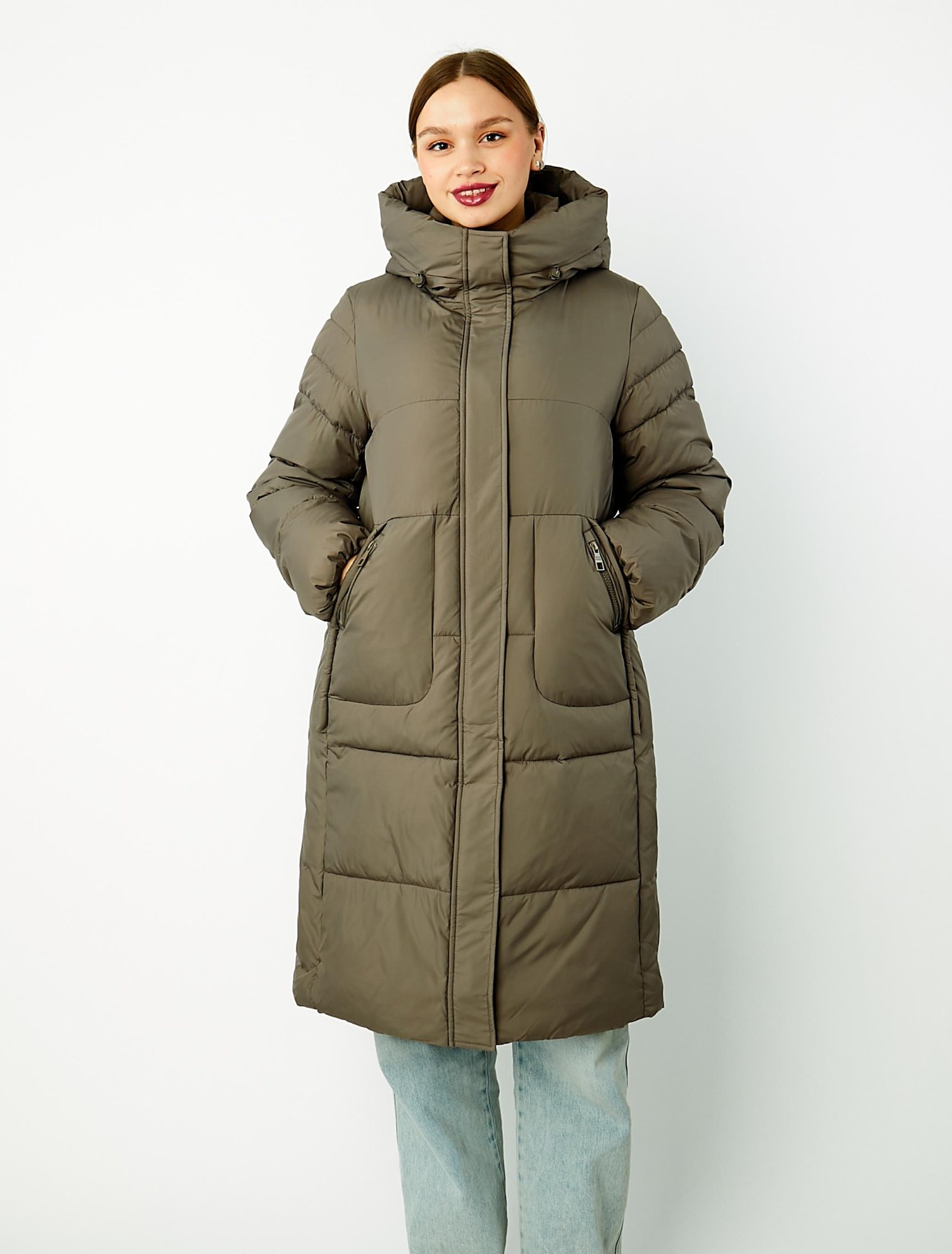 Женское пальто прямого силуэта с регулируемым по объёму капюшоном и воротником-стойкой. Модель застёгивается на молнию с двумя бегунками, прикрытую ветрозащитной планкой с кнопками. Втачной рукав на резинке дополнен внутренней трикотажной манжетой в тон изделия. Боковые карманы с декоративными молниями имеют диагональный вход и фиксируются при помощи магнитных застёжек. Модель оформлена горизонтальной стёжкой и утеплена синтетическим наполнителем.