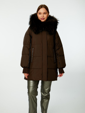 Женская куртка прямого силуэта с регулируемым по объёму капюшоном. Капюшон оформлен съёмной опушкой из натурального меха (тонированный енот). Модель застёгивается на молнию с двумя бегунками, прикрытую ветрозащитной планкой с кнопками. Втачной рукав с широкой трикотажной манжетой в тон изделия. Карманы декорированы металлизированной лентой и фиксируются потайными кнопками. В боковых швах расположены шлицы на кнопках. Куртка оформлена горизонтальной стёжкой и утеплена синтетическим наполнителем.