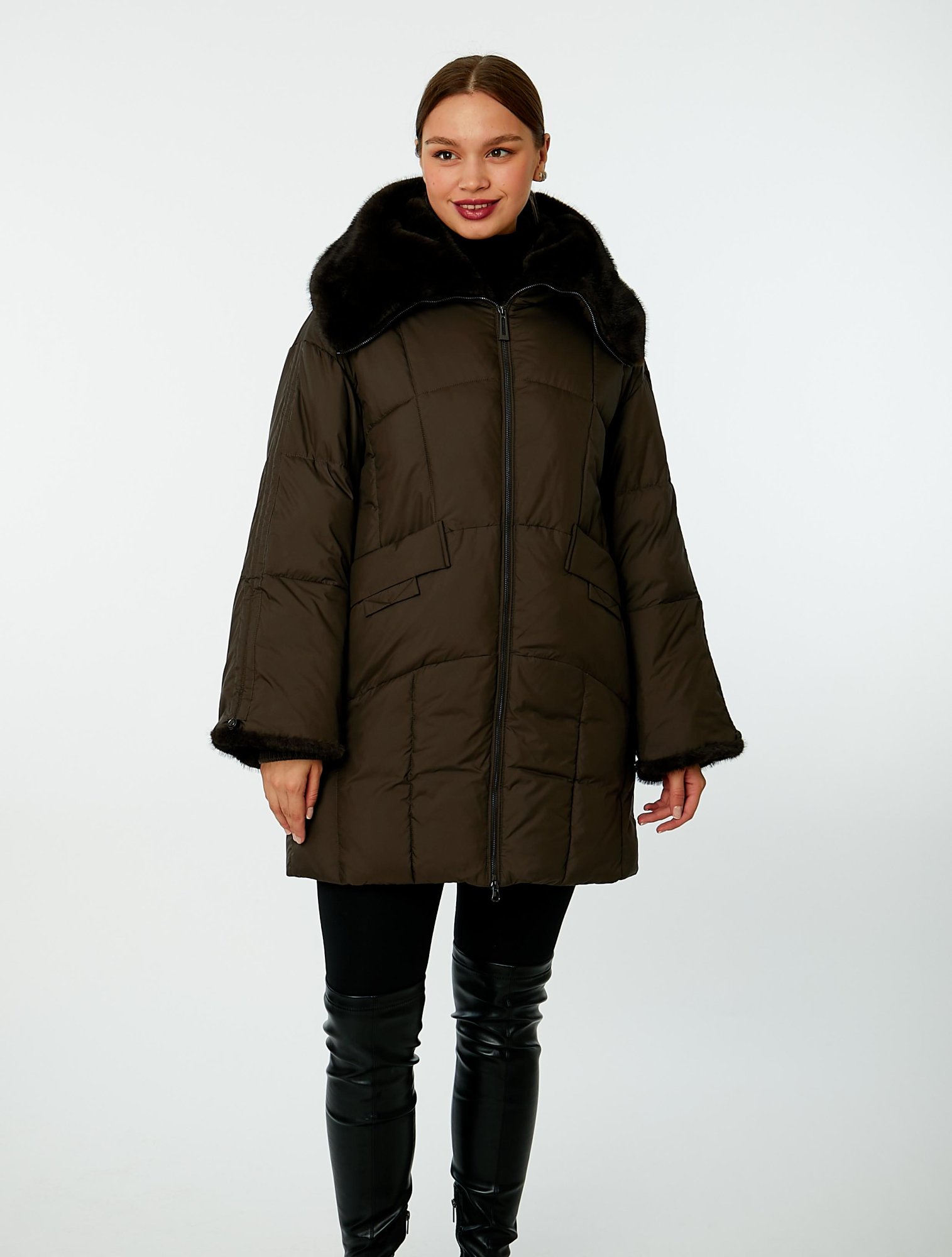Женское полупальто прямого силуэта с регулируемым по объёму капюшоном. Внутренняя часть капюшона выполнена из искусственного меха под норку. Модель застёгивается на металлическую молнию с двумя бегунками с внутренней ветрозащитной планкой. Рукав со спущенной линией плеча дополнен внутренней трикотажной манжетой. Боковые карманы с флисовой мешковиной фиксируются при помощи потайных кнопок. Полупальто оформлено геометрической стёжкой и утеплено синтетическим наполнителем.