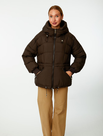 Современная женская куртка свободного силуэта с регулируемым по объёму капюшоном. Модель застёгивается на тракторную молнию с двумя бегунками с внутренней ветрозащитной планкой. Рукав со спущенной линией плеча с трикотажной манжетой. Боковые карманы с флисовой мешковиной имеют диагональный вход и фиксируются молниями. Ширина изделия по линии талии и по низу регулируется кулисками. Куртка оформлена геометрической стёжкой и утеплена синтетическим наполнителем.