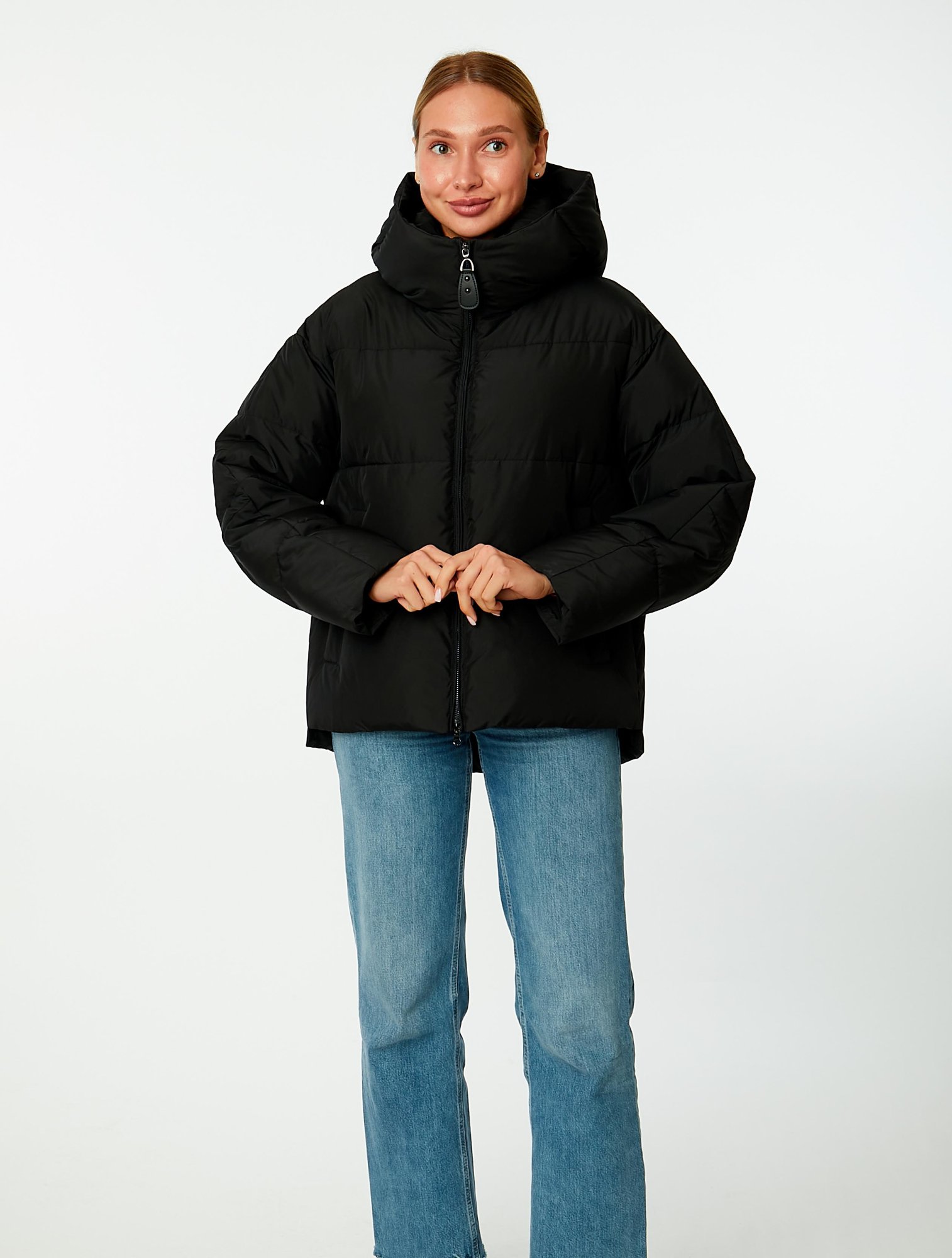 Стильная укороченная женская куртка свободного силуэта с капюшоном и воротником-стойкой. Модель застёгивается на металлическую молнию с двумя бегунками с внутренней ветрозащитной планкой. Рукав со спущенной линией плеча дополнен трикотажной манжетой в тон изделия. Боковые карманы с флисовой мешковиной фиксируются магнитными застёжками. Куртка оформлена горизонтальной стёжкой и утеплена синтетическим наполнителем.