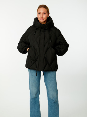 Укороченная женская куртка свободного силуэта с регулируемым по объёму капюшоном. Модель застёгивается на молнию с двумя бегунками, прикрытую ветрозащитной планкой с потайными кнопками. Рукав со спущенной линией плеча на притачной манжете. Боковые карманы имеют диагональный вход. Ширина низа изделия регулируется при помощи кулиски. Куртка оформлена ромбовидной стёжкой и утеплена синтетическим наполнителем.