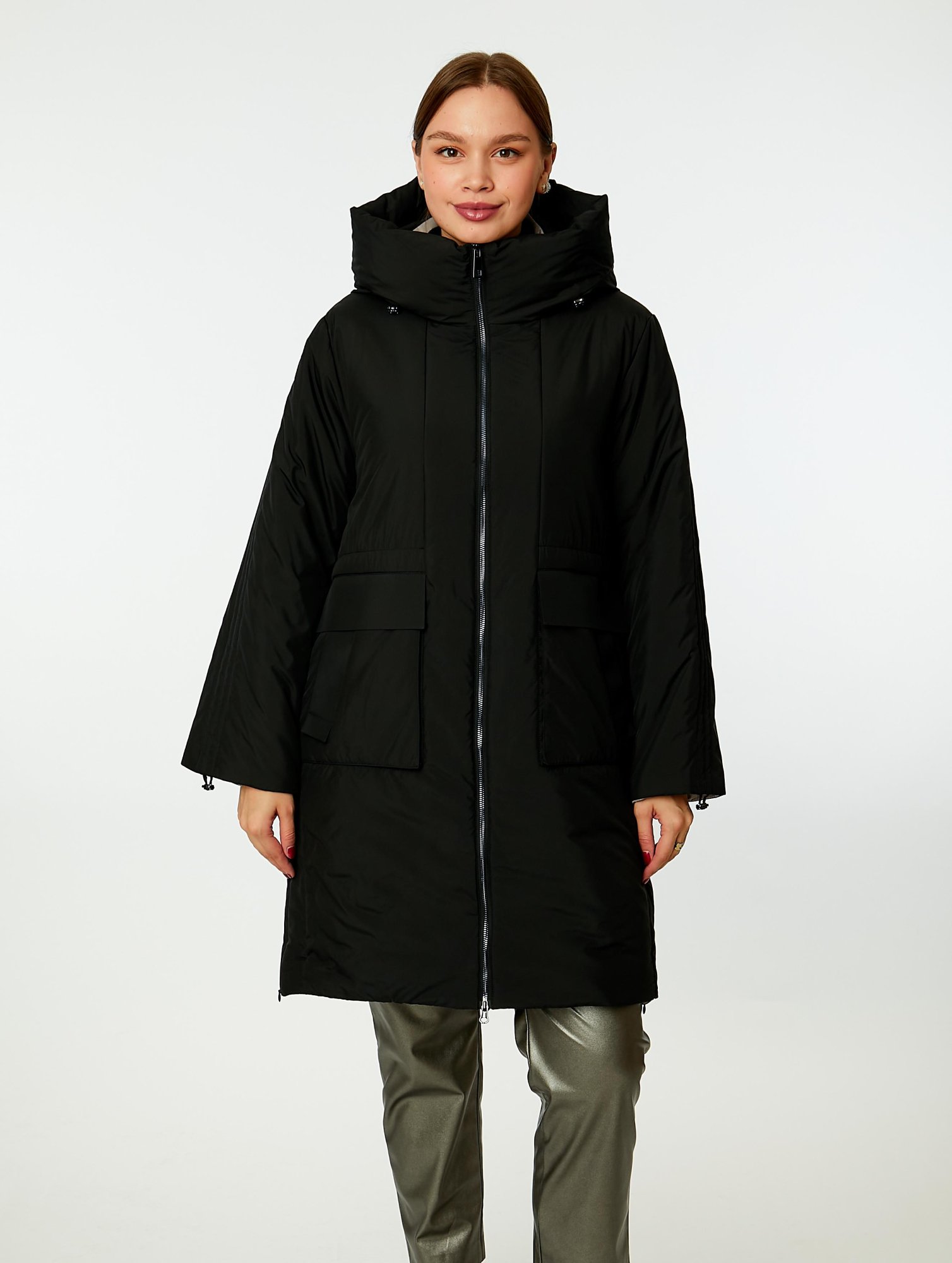 Женское полупальто прямого силуэта с регулируемым по объёму капюшоном и воротником-стойкой. Модель застёгивается на металлическую молнию с двумя бегунками с внутренней ветрозащитной планкой. Втачной рукав. Боковые карманы с декоративными клапанами фиксируются при помощи магнитных застёжек. Ширина изделия по линии талии регулируется кулиской. Полупальто выполнено из матовой ткани и утеплено синтетическим наполнителем.