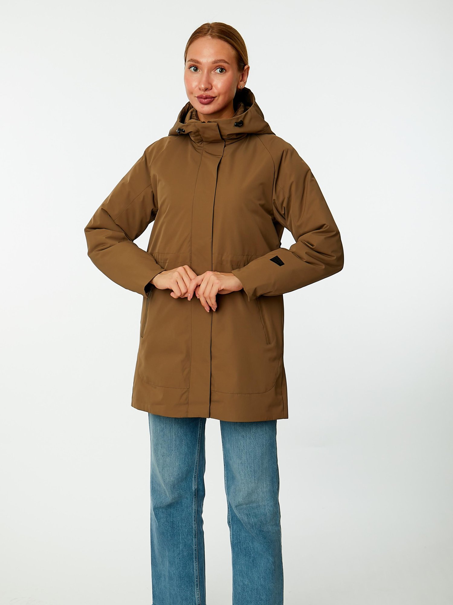 Современная женская куртка 2 в 1 прямого силуэта с регулируемым по объёму капюшоном. Модель застёгивается на молнию, прикрытую ветрозащитной планкой с потайными кнопками. Рукав втачной. Боковые карманы фиксируются при помощи молний. На спинке изделия расположена отлетная кокетка с буквенным принтом. Ширина по линии талии регулируется потайной кулиской. Куртка утеплена синтетическим наполнителем.