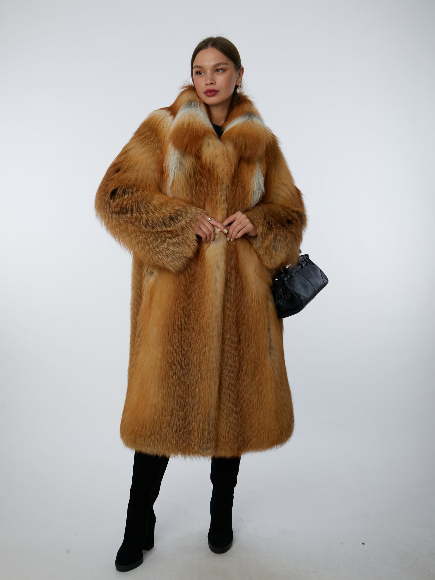 Длинная шуба из меха рыжей лисицы с воротником стойкой. Модель А-силуэта выполнена паркетной сборкой в росшив. Фронтальная застежка на шубные крючки. Втачные рукава и прорезные карманы с боковым входом.