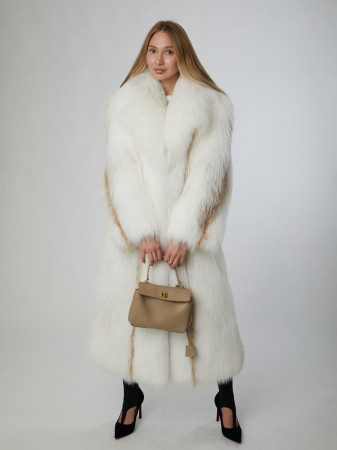 Длинная шуба из меха белой лисицы породы "фенек" с английским воротником. Модель А-силуэта выполнена паркетной сборкой в росшив. Фронтальная застежка на шубные крючки. Втачные рукава и прорезные карманы с боковым входом.