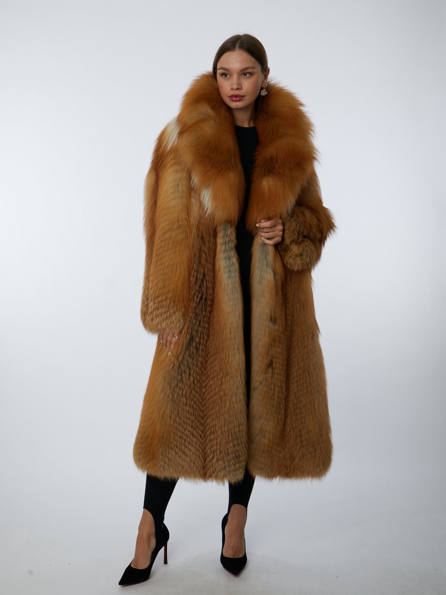 Длинная шуба из меха рыжей лисицы с английским воротником. Модель А-силуэта выполнена паркетной сборкой в росшив. Фронтальная застежка на шубные крючки. Втачные рукава и прорезные карманы с боковым входом.