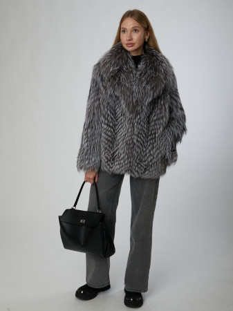 Укороченная шуба из меха чернобурой лисицы с английским воротником. Модель прямого силуэта выполнена паркетной сборкой в росшив. Фронтальная застежка на шубные крючки. Втачные рукава и прорезные карманы с боковым входом.