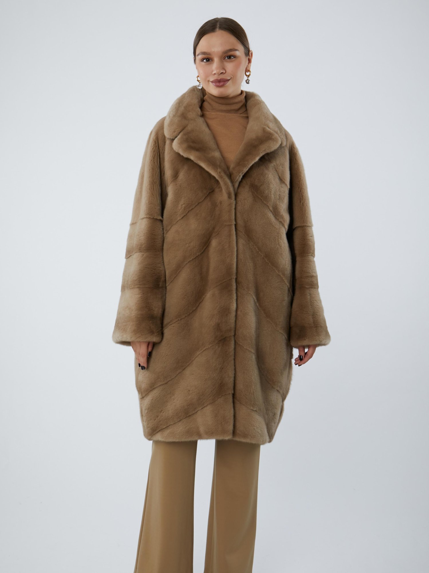Шуба из аукционного меха норки бежевого оттенка с английским воротником. Модель О-силуэта с комбинированной раскладкой меха и фронтальной застежкой на шубные крючки. Цельнокроенные рукава регулируются по ширине с помощью кулисы. Прорезные карманы с вертикальным входом.