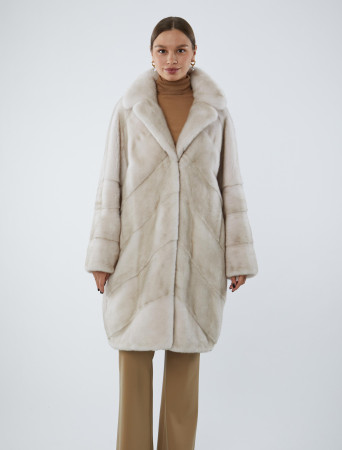 Шуба из аукционного меха норки светлого оттенка с английским воротником. Модель О-силуэта с комбинированной раскладкой меха и фронтальной застежкой на шубные крючки. Цельнокроенные рукава регулируются по ширине с помощью кулисы. Прорезные карманы с вертикальным входом.