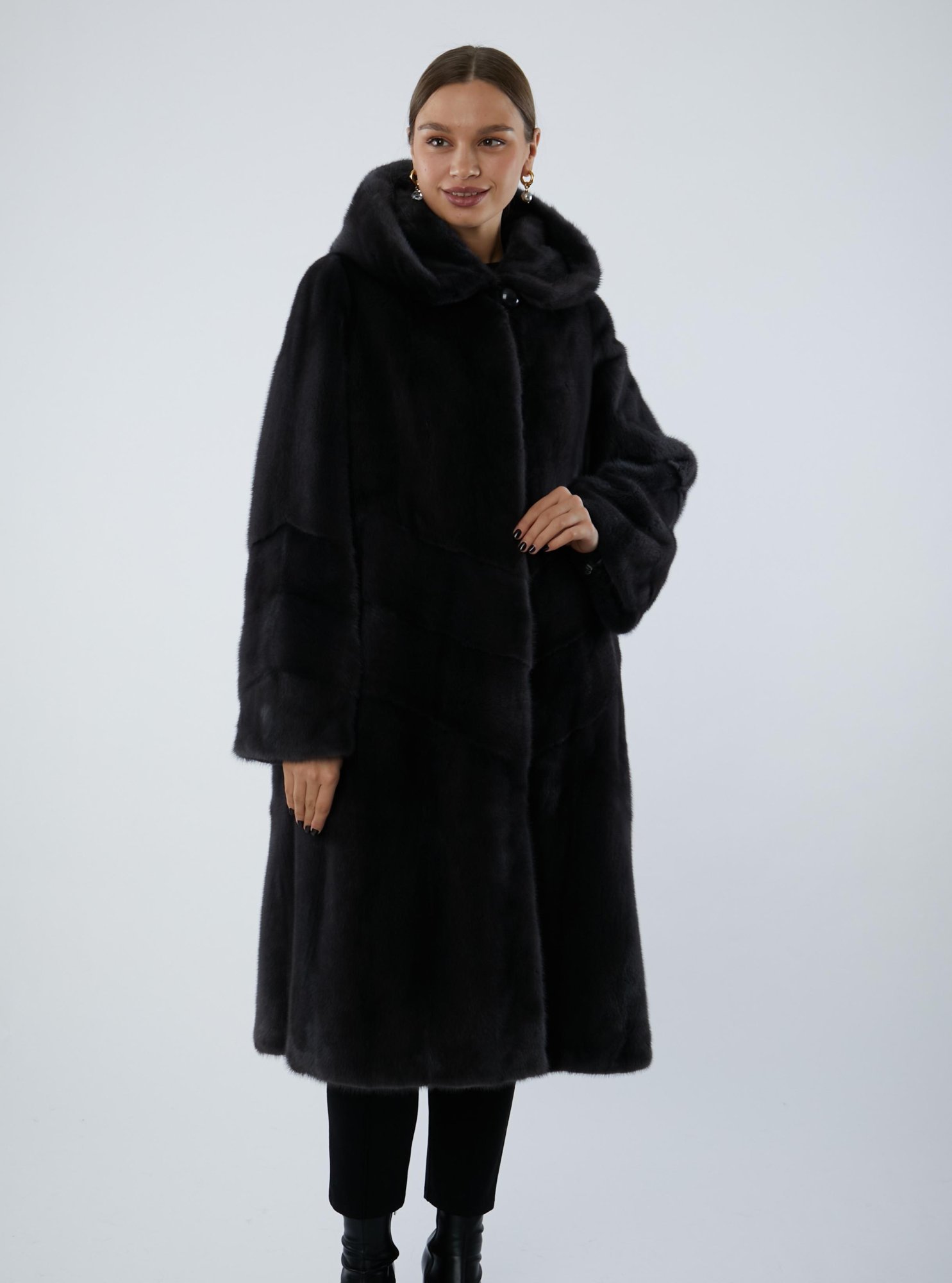 Длинная шуба из меха норки с теплым капюшоном. Модель А-силуэта с комбинированной раскладкой меха и фронтальной застежкой на шубные крючки. Втачные рукава с поперечными вставками из меха и регулируемой кулисой. Удобные прорезные карманы с теплым подкладом.